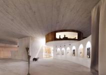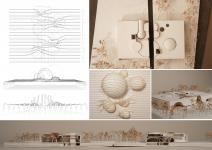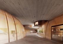 The curved concrete structure is informed by a conceptual yarn grid developed through balloon deflation studies. As the balloon contracts, the attached strings shift in shape and position, forming a responsive, landscape-integrated framework. The building retains this language through its curvilinear roof and spatial transitions. Material choices reinforce this transformation: warm wood-lined interiors contrast with the cool, monolithic concrete shell, offering diverse sensory experiences as visitors move through the space.