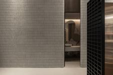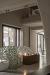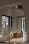By using soft materials and delicate lighting, we create a sense of movement among the unmovable items. We want the space to be affluent, feeling as if one is in a natural cave, experiencing how the client’s products are created from materials to art pieces. For instance, we reused the offcuts and defective products from the clients and turned them into handmade tile pieces for the wall, like a mosaic, allowing the raw beauty of the material to speak for itself. Each piece shows its own unique handmade traces and tells its craft story. The nearby stainless steel display shelf also reflects that beautiful design in simplicity. At the same time, when new products are to be displayed, there is no need to redecorate the entire showroom, reducing the waste cost in business redecoration and promoting a more sustainable retail space. In this unique showroom & retail space, we designed a natural-like interior space as a tribute to our main target: the products, hoping to bring all visitors an immersive museum-like experience.