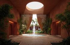 At the heart of the resort lies the ring-shaped Wellness Center, conceived not merely as a facility, but as the emotional and spiritual core of the entire composition. Its ring-shaped structure embodies connection and infinity, housing within its protective geometry a lush internal oasis. Guests enter a realm of calm and sensory immersion—thermal baths, hammams, treatment rooms, and meditation spaces surround a tranquil water garden shaded by palm canopies. Here, filtered sunlight penetrates through terracotta latticework, dancing across water surfaces and earthen walls, creating an atmosphere of quiet transcendence. The architecture feels ancient in its symbolism, yet forward-looking in its ecological intelligence and spatial fluidity.