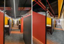This building demonstrates an industrial aesthetic inspired by precision and utility, with exposed structural elements and a practical material palette that includes epoxy flooring, galvanized steel elements, and modular wall systems. Sustainability is embedded in the design through natural ventilation shafts, water-efficient fixtures, and roof-mounted photovoltaic tiles that contribute to the building’s energy needs.
