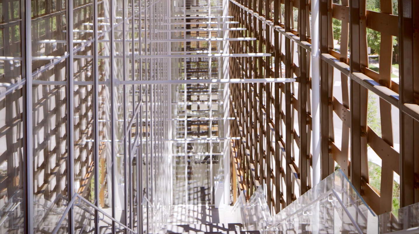 The museum’s key design features include: the Grand Stair, the Moving Glass Room Elevator, the Woven Wood Screen, the Wood Roof Structure and the Walkable Skylights. The woven wood exterior screen is made of a leading edge composite material that is an amalgam of paper and resin encased within a dual-sided wood veneer.
