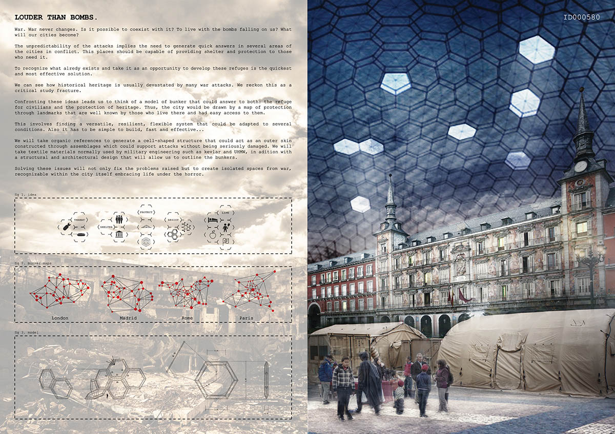 In the 24H competitions, participants develop their conceptual ideas in just 24 hours and that is the challenging issue of the competition. The program is given on the competition day. Celebrating its 16th edition with raWar, this edition of the competition asked to competitors to design a bunker for "a temporary war refuge" that can be reproduced several times in different points of the city that is under attack.