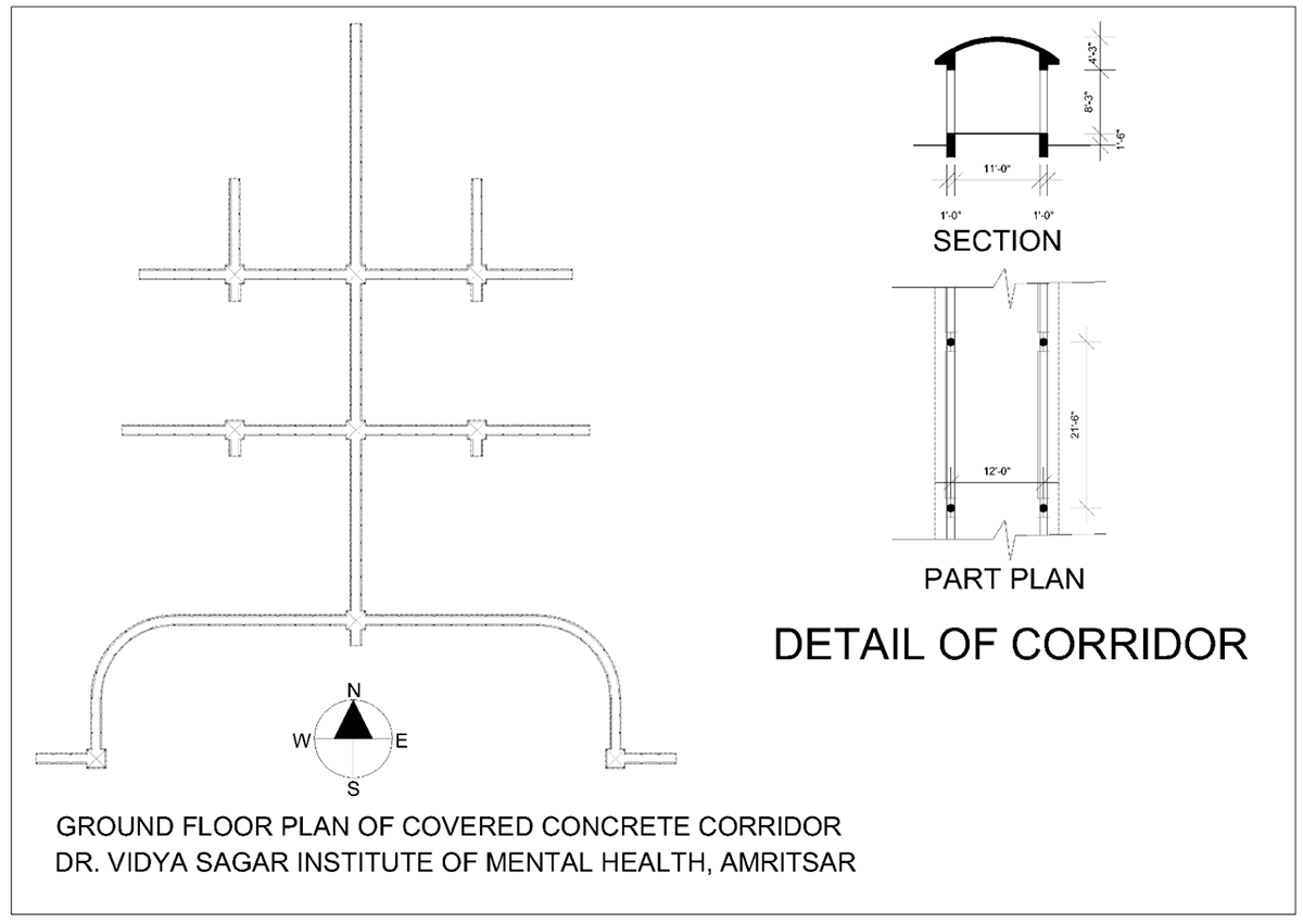 The entire hospital complex has been linked by vaulted concrete corridor running independently through open spaces with greenery on both the sides. Built-up benches have been provided at certain intervals for casual sitting while walking in the corridor. The intersections of two corridors have been developed as a 6 metre by 6 metre chowk with high roof.