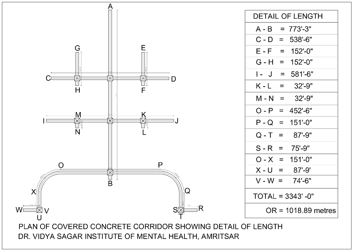 The GWR testimony states, "The longest covered concrete corridor has a total length of 1018,89 metres (3342 feet 9.7 inches) and was designed by Sarbjit Singh Bahga (India) to connect the various buildings of the Dr. Vidya Sagar Institute of Mental Health, Amritsar, Punjab, India."