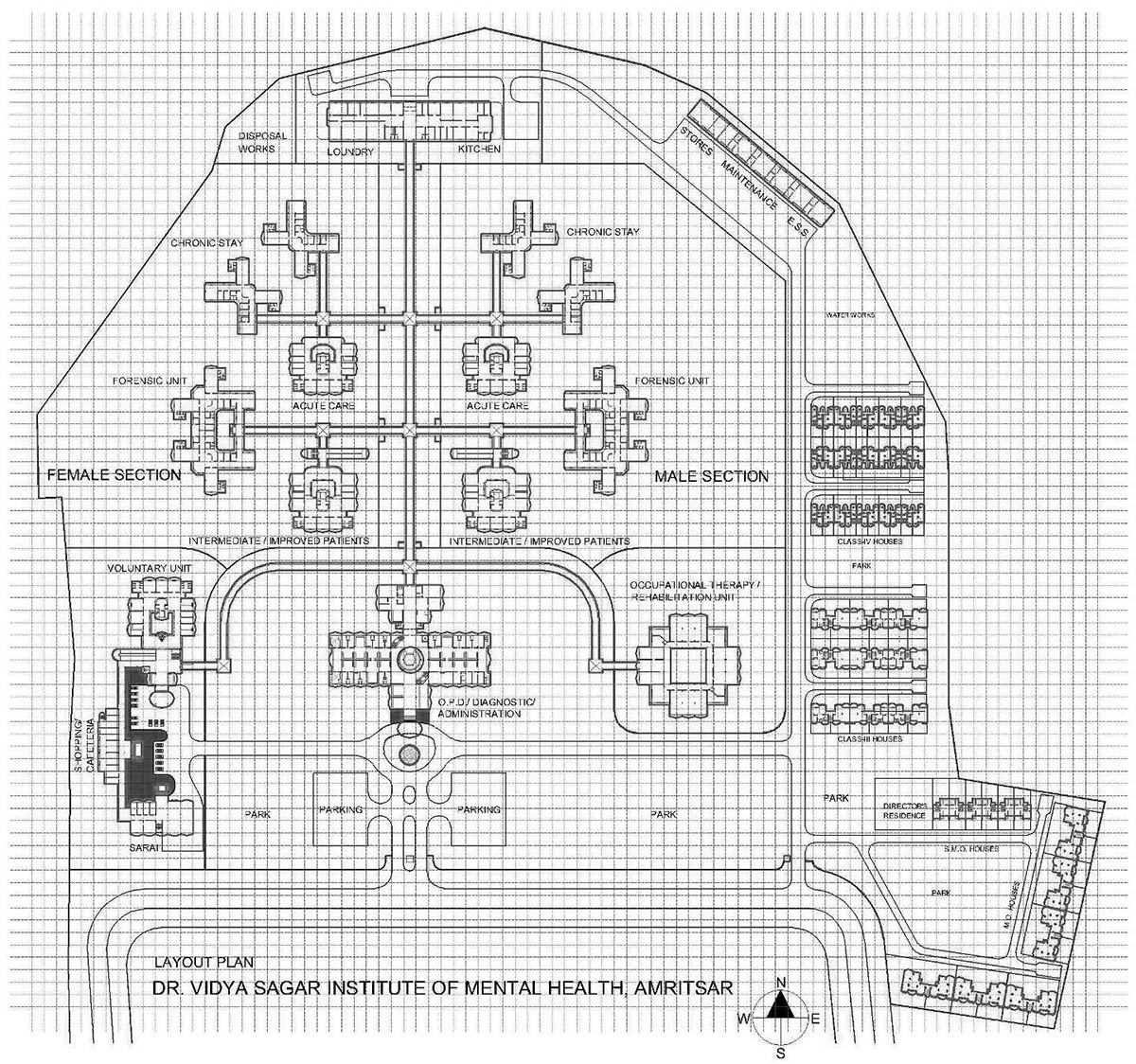 Vidya Sagar Institute of Mental Health has been designed and built on a site of 18 hectares in Amritsar. The campus consists of a number of building blocks to meet the peculiar requirements of a mental hospital. All these blocks have been laid on a strict Cartesian pattern with symmetrical juxtaposition reminiscent of tradition Indian campuses. The built-up masses and open spaces are ingeniously interwoven to create a building-in-the-garden effect.