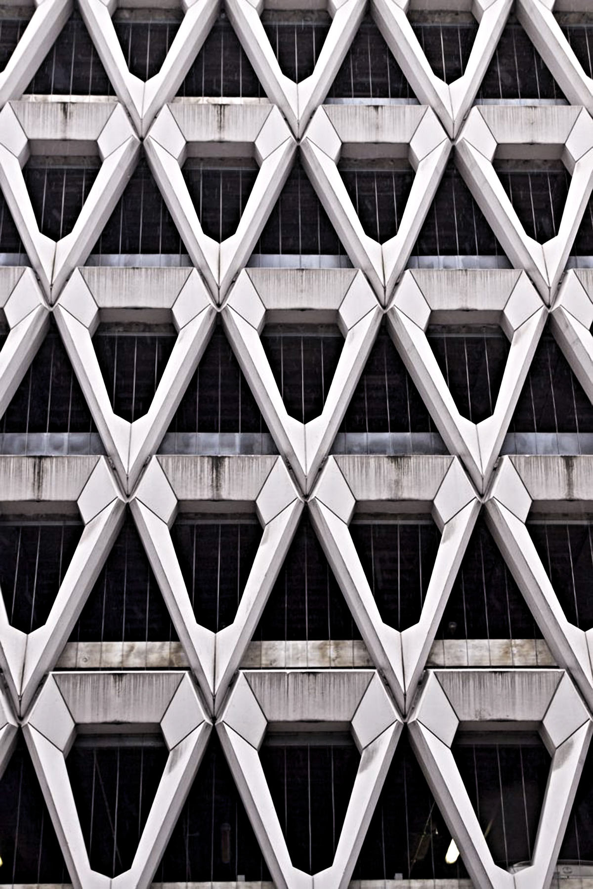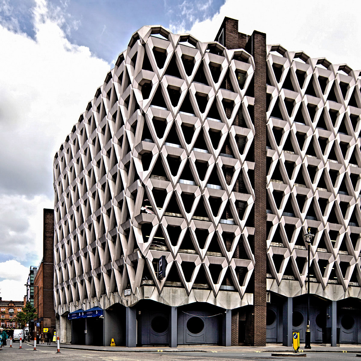 Located on London’s Oxford Street, the Welbeck Street car park draws a very distinctive design with its diamond-patterned facade made up from prefabricated concrete. The project was originally designed by Michael Blampied and Partners in the 1960s (1968-70) and planned for local department store Debenhams.