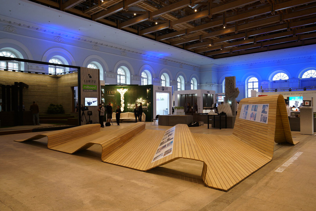 Gokhan Karakus: The exhibition shows the 15 projects but importantly does do in a public space of its own. The design developed by speech: architects Sergei Tchoban, Alexandra Sheyer is a public space itself, a seating area within the Arch Moscow trade fair. So as visitors sit down and interact they are also exposed to these projects in a casual way which is very interesting. The exhibition material is not in your face but tries to casually expose you to the projects. The space of the exhibition carries you to the content, it priorities interaction over content.