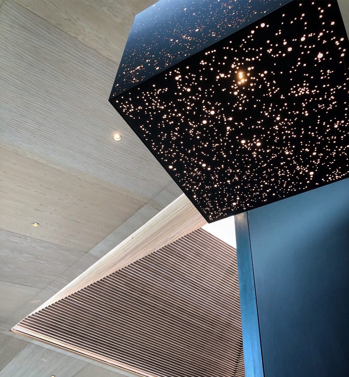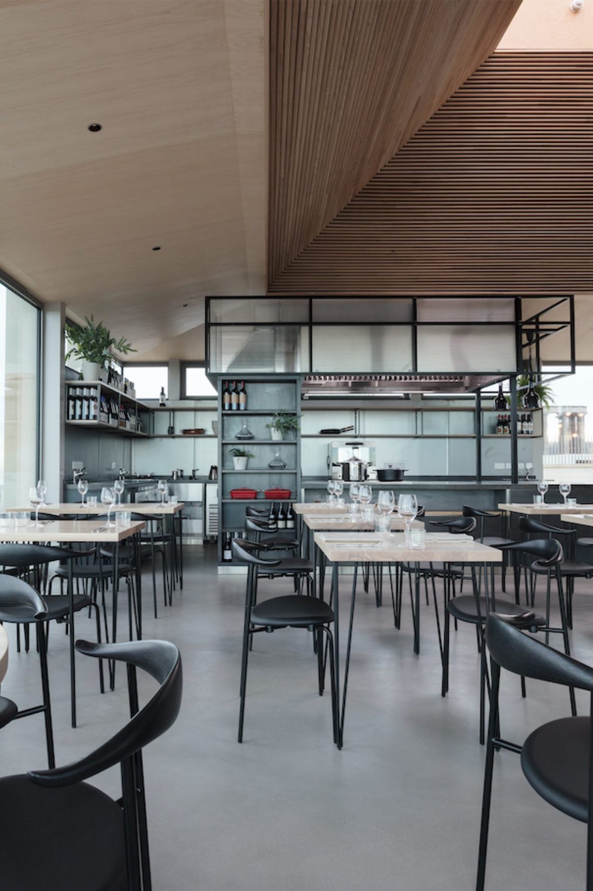 Therefore, the restaurant is "perched elegantly over the city, balancing technical skills and creativity. Floor to ceiling glazing allows patrons to focus on the surrounding views. The carefully restored observatory is visually connected to the restaurant interior by an elegantly fluted ceiling and, star constellation laser cut into a dramatic pendant that forms the perfect frame to view the night sky."