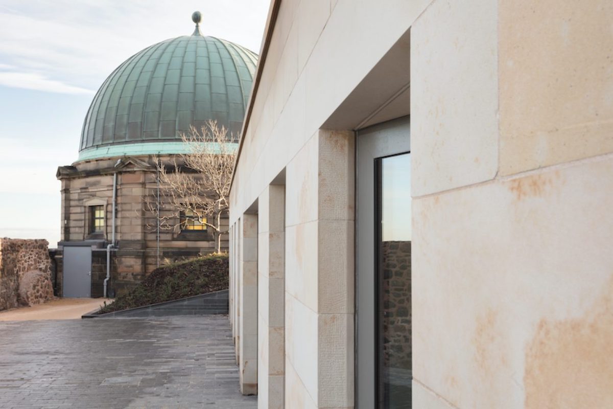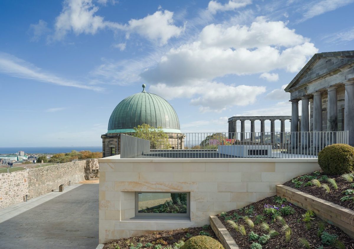 As explained by the architects, "the integration of a new gallery and office space for Gallery was achieved by excavating into the hillside to the north of the City Observatory. This earth-sheltered building, which sits a storey lower than the Observatory, becomes integral to the landscape due to roof terrace above, and from here panoramic views from Edinburgh Castle in the west around to the National Monument to the east can be enjoyed."