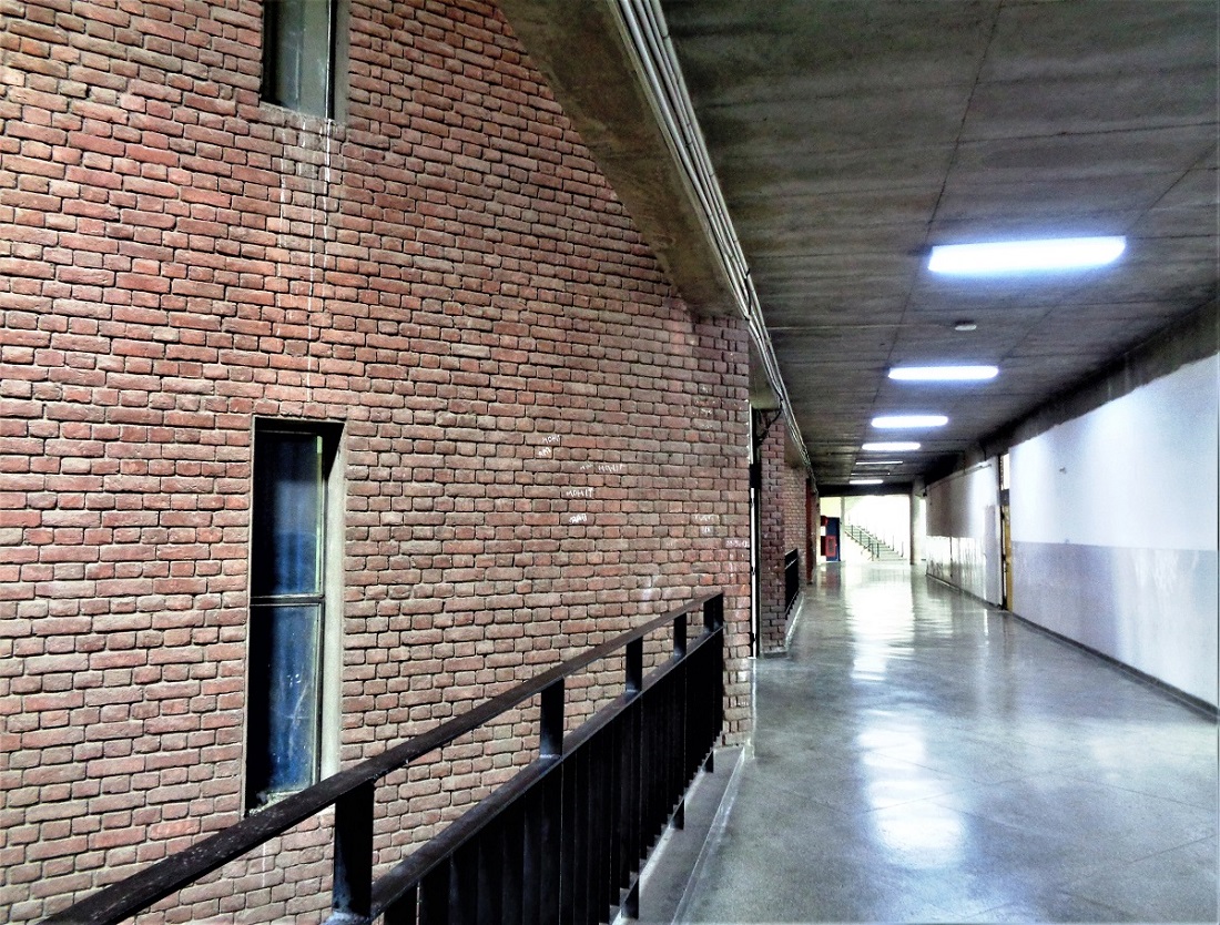 The Dr Ambedkar Institute of Hotel Management, Sector-42, is another campus designed by RS Lall in exposed brickwork. The campus accommodates some building blocks designed around central courtyards. These blocks have been arranged in a Cartesian pattern thus bringing in a strict geometrical order. The network of roads and tree plantation on the campus also follow this strict geometrical order. The bold facades of the buildings in monochromatic brick face bear the signatures of RS Lall and are in a significant departure from Pierre Jeanneret’s architecture who usually preferred a combination of two or three materials together. But the overall architectural expression is in harmony with the so-called Chandigarh style of architecture.
