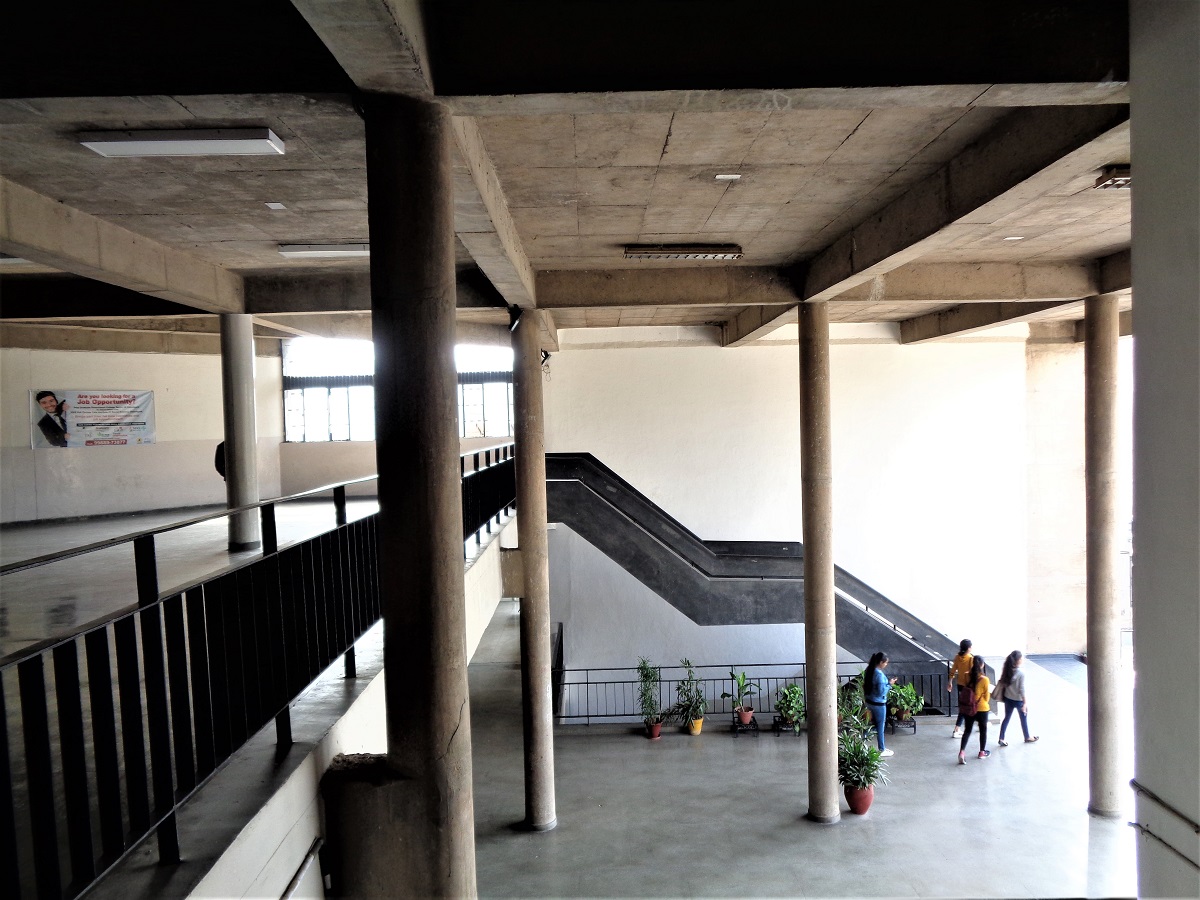 The Post Graduate Government College for Girls, Sector-42, was established in 1982. It has a sprawling campus spread over 18 acres adjacent to the Leisure Valley. The buildings in the campus are generally four-storied high and designed in reinforced-concrete-frame structure with RCC columns on regular intervals. These columns are left exposed on the external facades. All the other surfaces are in unadorned brickwork. The truthful expression of RCC components and brick surfaces reflects the influence of Pierre Jeanneret and Le Corbusier’s architecture in Chandigarh.