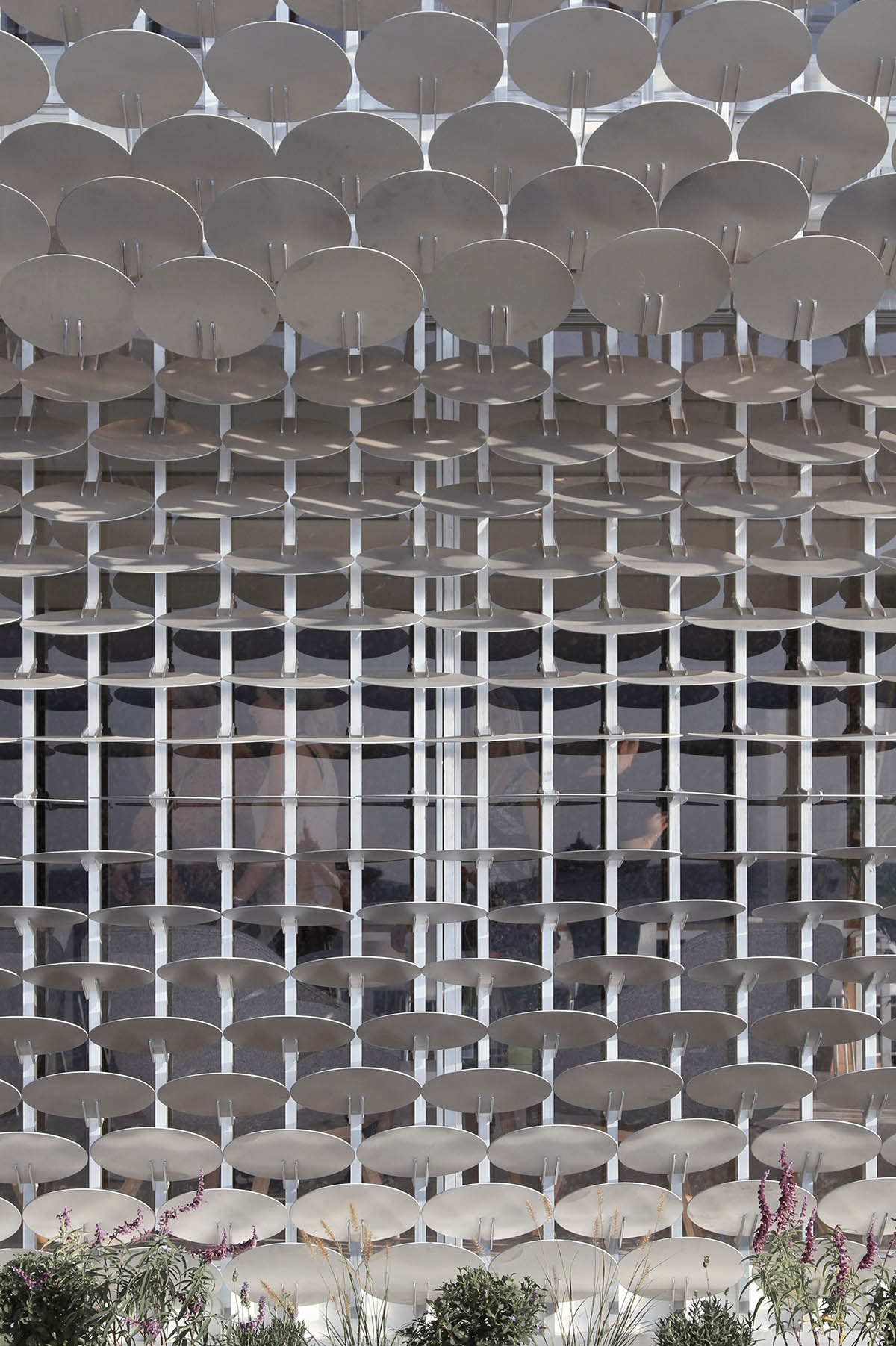 The skin of the structure has been conceived as the foremost a mechanism for controlling the visual transparency of the building. The sculptural composition of the skin is made of thousands of recyclable aluminium "petals" which resulted in an object of inherent natural beauty.