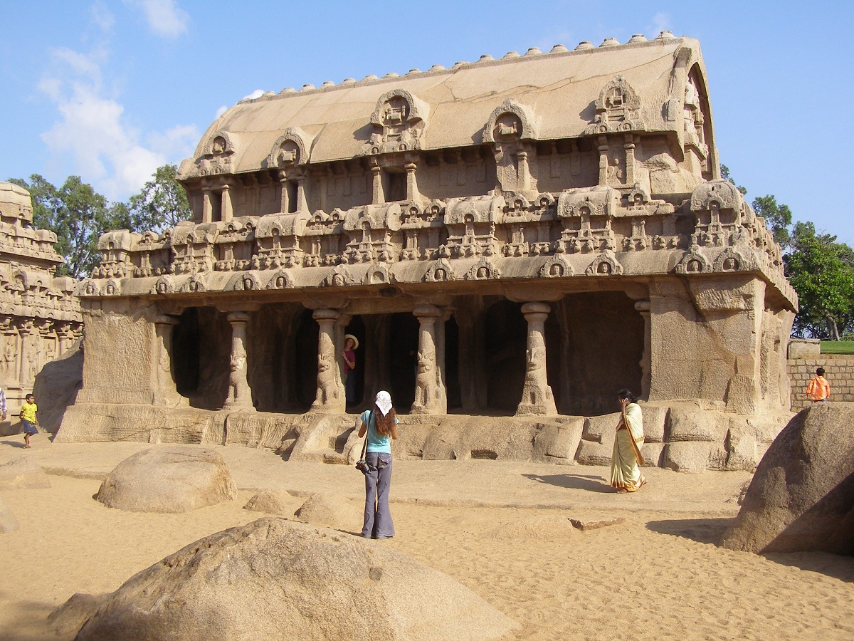 Of these four are in a row and the fifth one i.e., of Sahadeva, stands opposite the Arjuna Ratha. The Dharmaraja Ratha is the largest and most complete of the five rathas. It combines all the features of Pallava style-pillars in the portico with rampant lions, the pyramidal tower and the turreted roof.