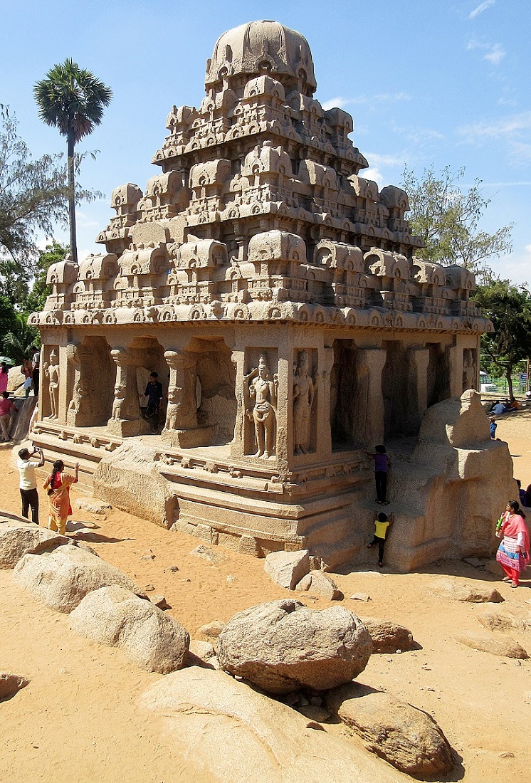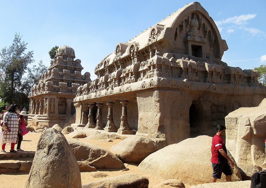 Pancha Rathas are other rock-cut masterpieces. These shrines are called rathas (chariots) because they resemble the big temple cars in which the images of the deities are taken out on procession. These monolithic structures in granite are rated as excellent examples of Pallava art. These five rathas are now known as Pancha Pandava Rathas. Four of them have been named after four of the five sons of Pandu, i.e., Dharmaraja, Bhima, Arjuna, and Sahadev. The fifth has been named after Draupadi, their common wife.