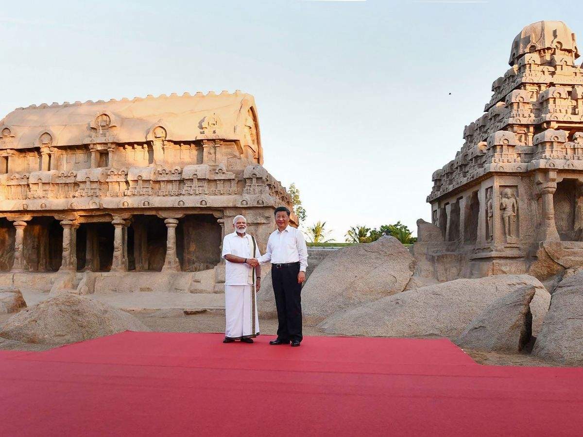 Narendra Modi and Xi Jinping in the campus of Pancha Rathas. Photo Courtesy of indiatimes.
