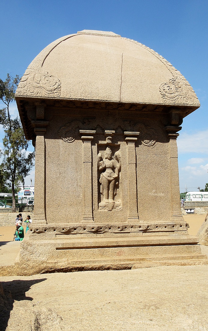 The Draupadi Ratha is modelled after a hut with a vaulted straw roof and is as simple as it is elegant. It shares a common platform with Arjuna Ratha. In this ratha the image of Draupadi is enshrined as the goddess of Lakshmi.
