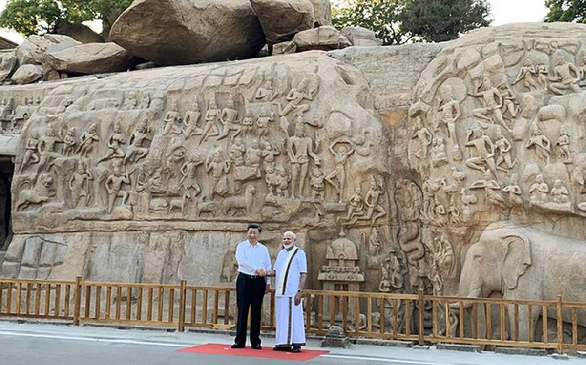 Narendra Modi and Xi Jinping in front of Arjuna's Penance. Photo courtesy of thehindubusinessline.