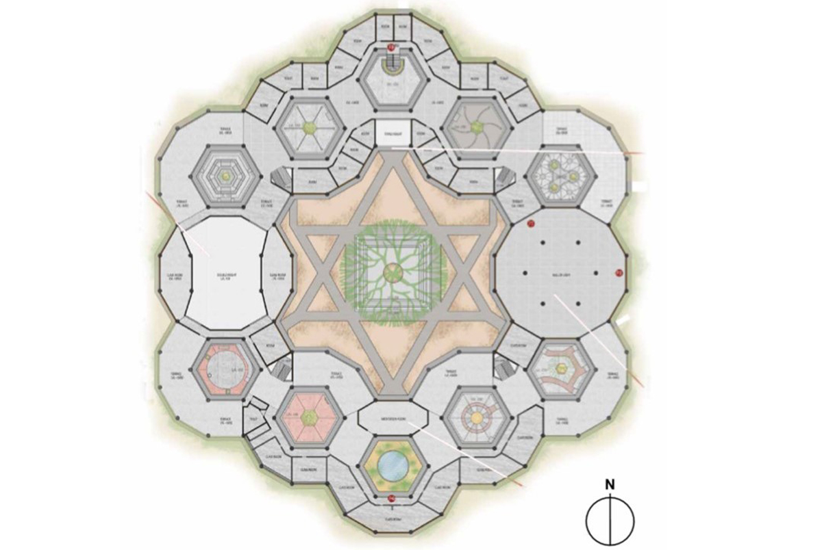 Configuring a flexible layout, such that the built scheme would be sustainable to be constructed and yet be adaptable for future renovations, was what the brief exactly desired. This was achieved through a grid, composed of squares and equilateral triangles, which could be repeated horizontally to create continuous forms and vertically to create floor plates. Each module of the conceived form spanned out as octagons measuring 7.2 m in the perimeter. To lay the structural grid, this length was further divided into 8 equal parts of 0.9 m measured centre to centre from each column, thus marking a clear span of 0.84m. The congruency of the structural dimensions was maintained while planning the commuting spaces, the furniture as well as entry points to each space.