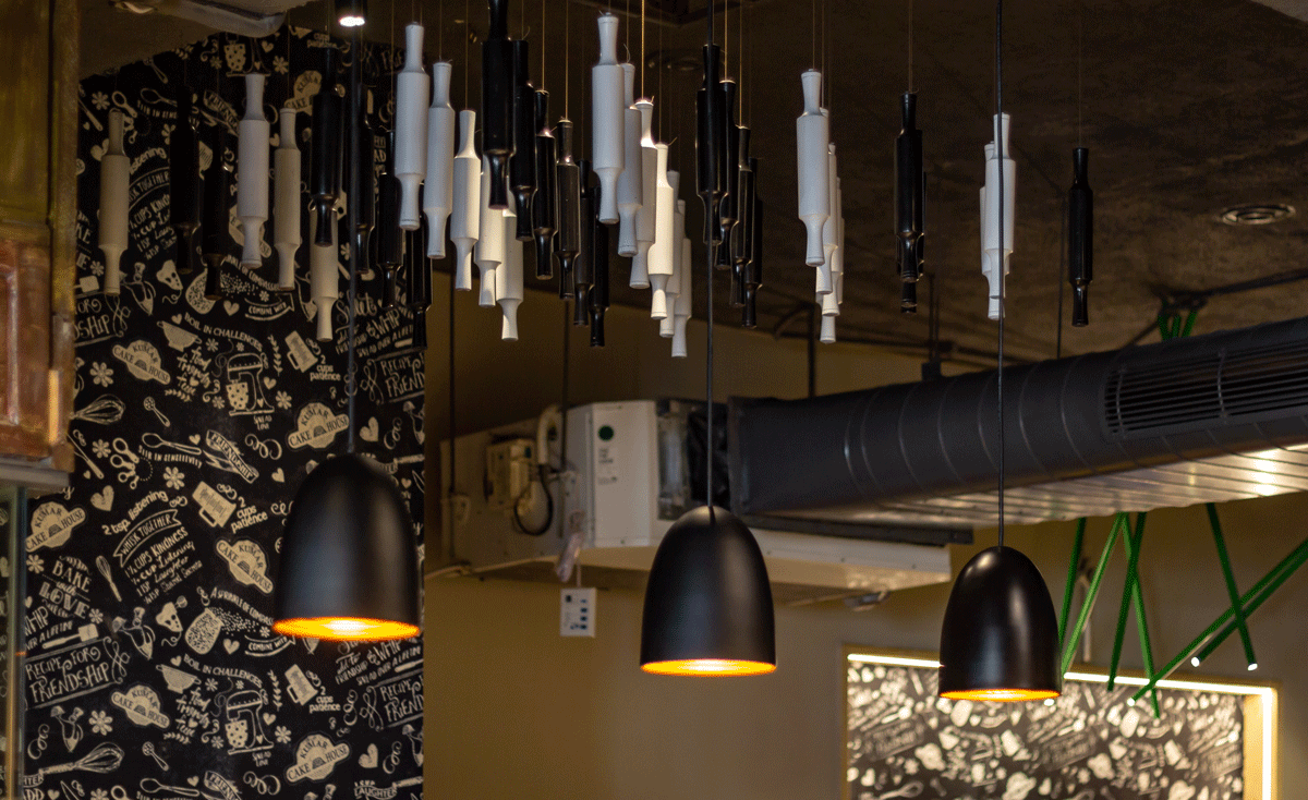 Located on busy Rainbow Street in Model Town, Jalandhar, the Kumar Bakery is a foodie’s paradise and designer’s delight rolled into one entity. Cake Boy is the hero of this story. With a Cool Boy persona, everything about him is dapper and stylish – from his ingenious sunglasses which are LCD screens flashing the menu and orders, to his rugged face which is entirely sculpted out of nails! The design detailing definitely steals the cake (pun intended) at Kumar Bakery, some of the crowd favourites being the selfie point next to cake boy, catchy decals on the walls and the open kitchen with rolling pins hanging off the ceiling! Exposed red brick walls lend rustic warmth to the bakery, while the classic beechwood and mild steel combination adds that contemporary edge.