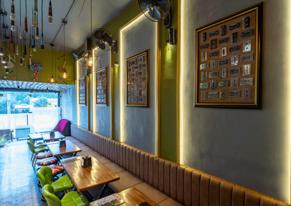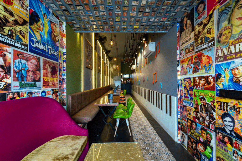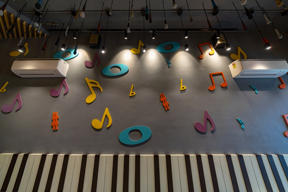 Located near Durga Colony, Jalandhar Punjab, Guftagu Café represents a Bollywood Movie bonanza from the Mumbai Fort area. The entrance is demarcated with posters and shots from veteran Bollywood movies of India. Space truly represents its name Guftagu that literally means to chit-chat and talk. This café rightfully serves as a centre for social interaction and a place to meet, greet, write and congregate. The old cassettes or the records have been upcycled in this project by and framing them in the display wall behind the seating. The colour combination of the café is also uniquely curated with multi-coloured variants in the furniture acting like a complete contrast to the darker shade green and greys. The café is designed in a linear fashion with tune symbols and a large piano painted on the adjacent wall from the sitting space. Besides this, the hanging mikes, skeleton framed bulbs and display of other musical equipment add a creative feel of dance, drama and magic to space.