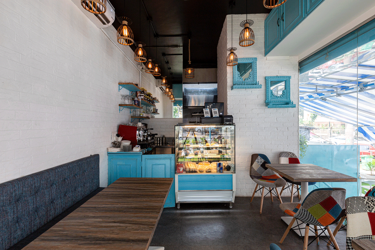 Located near Lokhandwala, Mumbai, the White Lama Café is the best place for a quick bite. It reflects Inspirations from the Greek cafés of Santorini, Greece. The blend of blue and white, depict coolness and calm ambience amidst the humid climate of the place. The area is strategically divided for a large outdoor seating to impart a relaxed and refreshing feel. The colour combination takes one into an island ambience with elegant décor and customized seating. The café in every detail engages the senses with the restful atmosphere, tasteful décor, refreshing beverages and delicious snacks. The outdoor seating is partially covered with the tented screens representing the bright sky amidst the bluest of seas. The visitors take back a delectable memory that stop for a cup of coffee or a quick leisure meal.