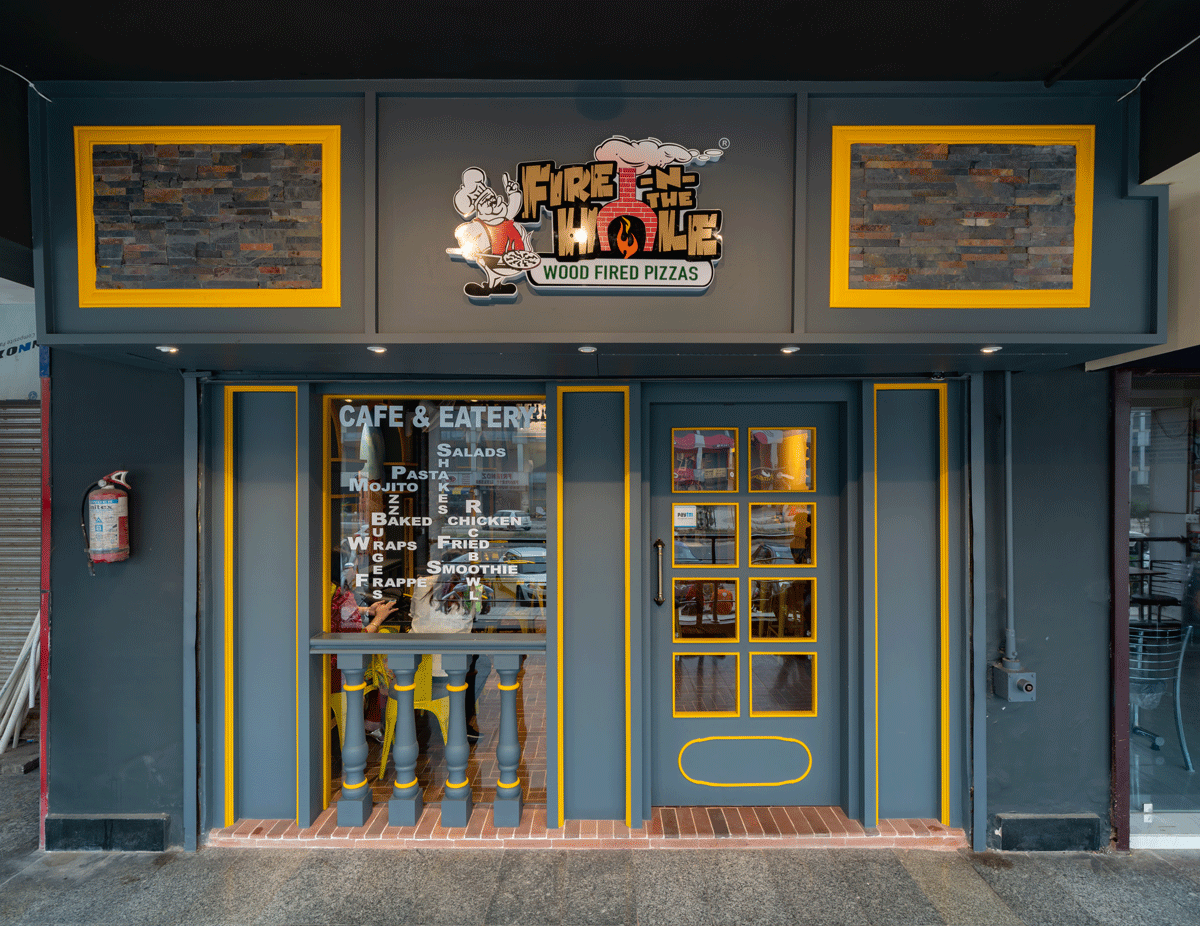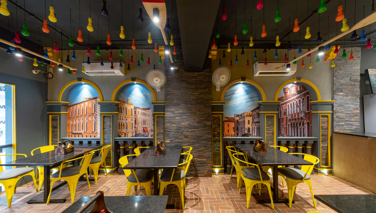 Located near the PPR Market in Jalandhar, Punjab, the Fire-in-The Hole has a North Italian feel. It largely reflects the Streets of Venice as one enters the space. It has a lot on the platter that attracts a creative person. Rustic Interiors and unique embellishments win the game. Be it be the coloured bulbs at the ceiling level, the coined interior wall, Herring and bone pattern flooring, semicircular blind arches depicting the Venice streets or the alternative patterns of stone cladding. All these elements blend harmoniously visually making the visitors travel to the origins while enjoying the cuisine. The colour combination of greys and yellow also create a magnificent feel and imparts an ethnic ambience to space. From a cultural viewpoint, this is an apt place to congregate, talk, and entertain one another in small groups.