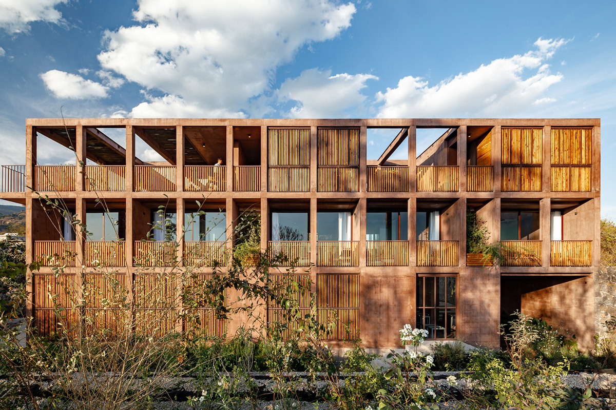 Mexican architecture firms Taller Carlos Marín and Pasquinel Studio have completed a gridded hotel made of pigmented concrete and volcanic stone to complete the natural terrain on a site located between Tepoztlán and Amatlán in the State of Morelos, Mexico.