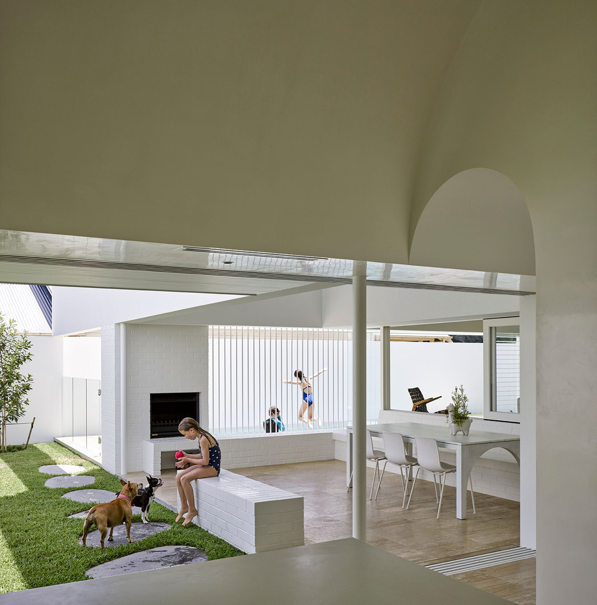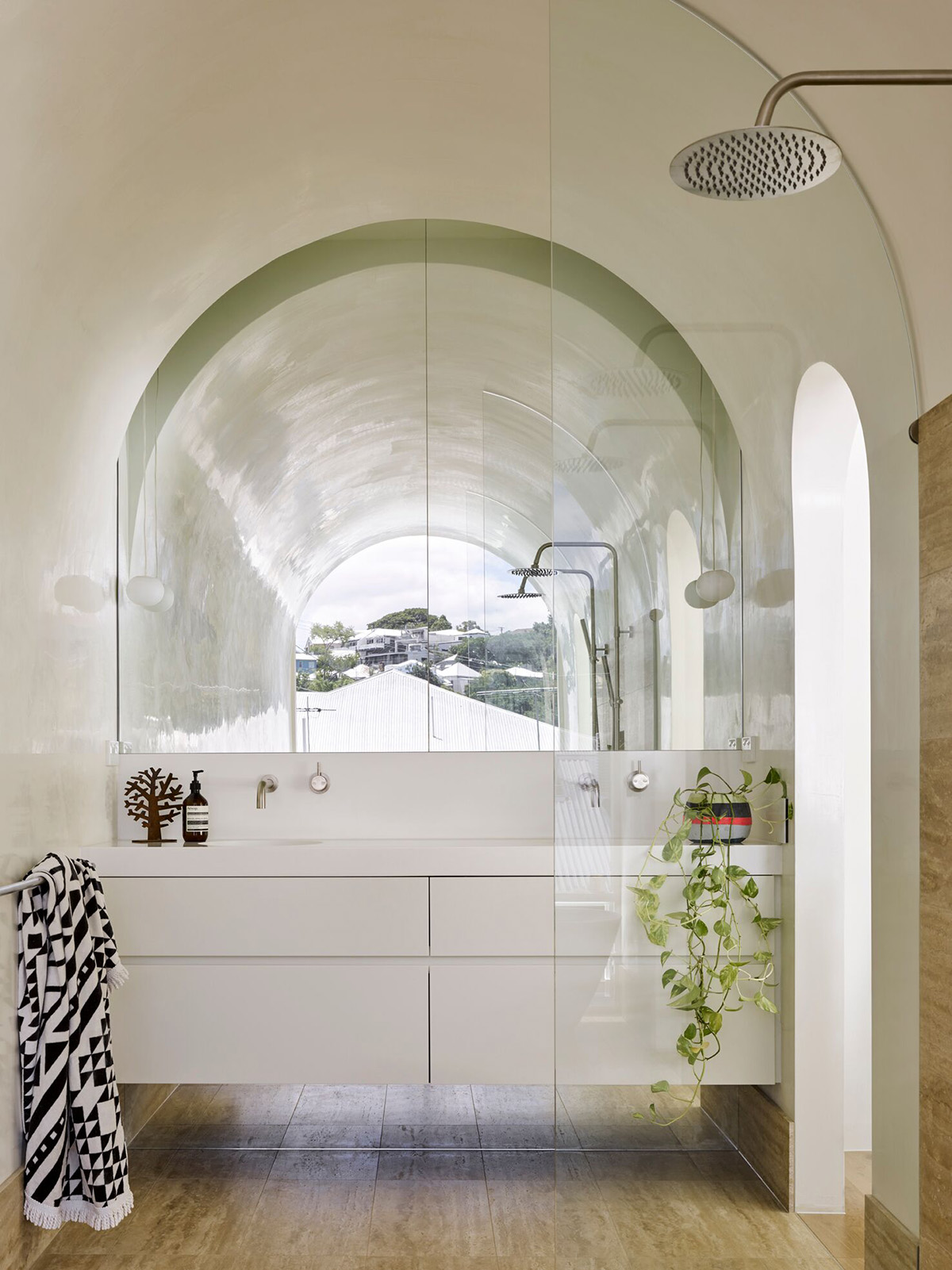 Internal and external volumes are expanded in a delightful sense of play, with geometric barrel vaults defining the significance of rooms. To extend the views from the inside of the house to the rich nature of Brisbane, Hogg and Lamb designed a series of openings to carefully frame the sky, trees and mountains.
