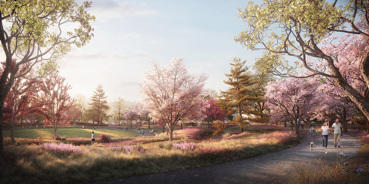 North-facing view of the Obama Presidential Center campus in Jackson Park. Image courtesy of The Obama Foundation