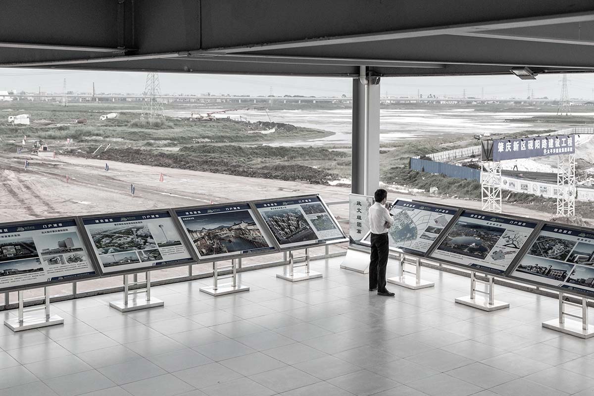 Plans, rendering and design drawings in the middle of the building site, 2017, Zhaoqing New Town, Zhaoqing, Guangdong Province. Image © Samuele Pellecchia.