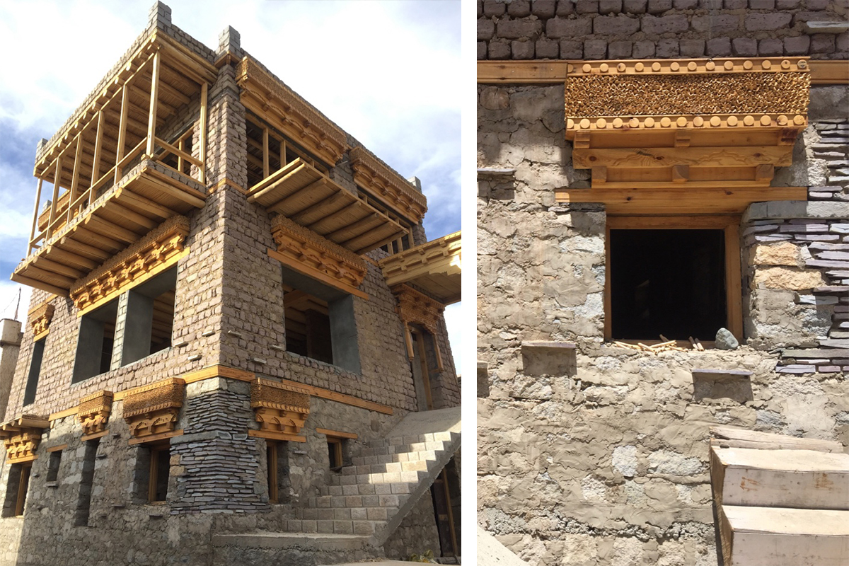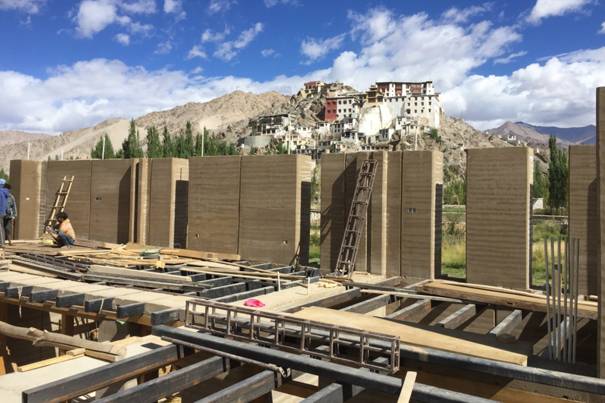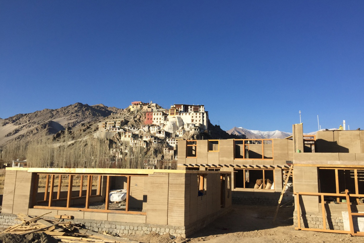 Ongoing construction of Spituk House with Spituk Gompa in the background (Earthling Ladakh). Image © Earthling Ladakh
