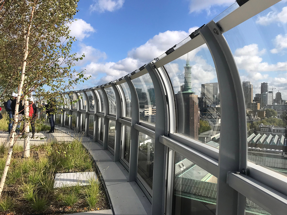 Winy Maas, when asked what the biggest challenges were in terms of combining the strong urban and architectural vision of the building, with the technical limitations or challenges, states that there were a couple of elements involved. Firstly, the construction of the foundations in order to support the building. Secondly, the material choice for the façade. Initially the design consisted of highly polished stainless steel, but that would exceed the budget. In the end the choice was made for glass, which then provided possibilities for transparent elements in the interior. And lastly, the creation of the forest on the roof.