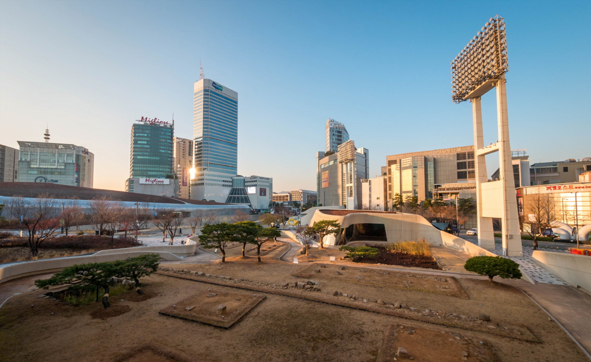 The concept of DDP lies within its relation to the Han river that passes through Seoul. The architects using a satellite observed the flow of the water and using the technology of fluid simulation created a frozen-like-wave structure. The green roof concept was applied to the structure, emphasizing the image of greenery running along a river. Previously the area was hosting the Dongdaemun baseball stadium which was the only stadium allowing amateur players to conduct games. During a press conference, the architect (Schumacher) (which can be visited on this link: https://www.korea.net/NewsFocus/People/view?articleId=118120) stated that the structure resembles or takes the form of an arena (creating a connection with the past). Interestingly, during the excavation, an enormous archeological site was found. So even though the memories on the surface were swept away, even older history emerged from beneath. As a result, an archeological park was designed that welcomed the historical Korean traditional garden, guarded by the preserved floodlights of the stadium (which can be visited on this link: https://www.korea.net/NewsFocus/People/view?articleId=118120).
