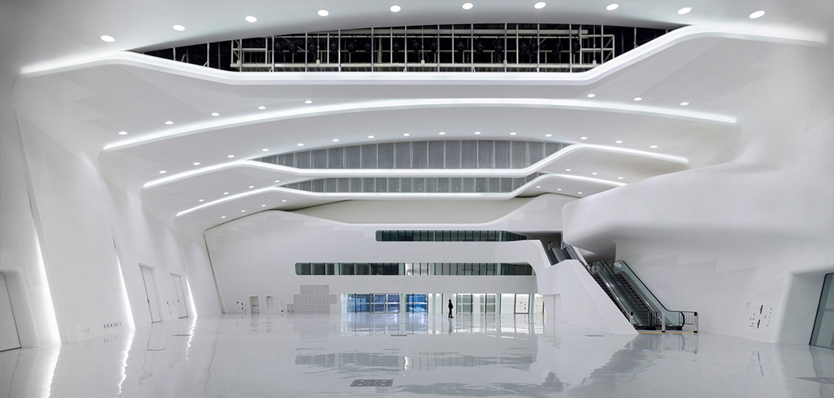 The lighting system is also designed along with the ceiling to avoid any disruption in the illusion of the frozen-like waves; the light seems to follow the path of the ceiling.