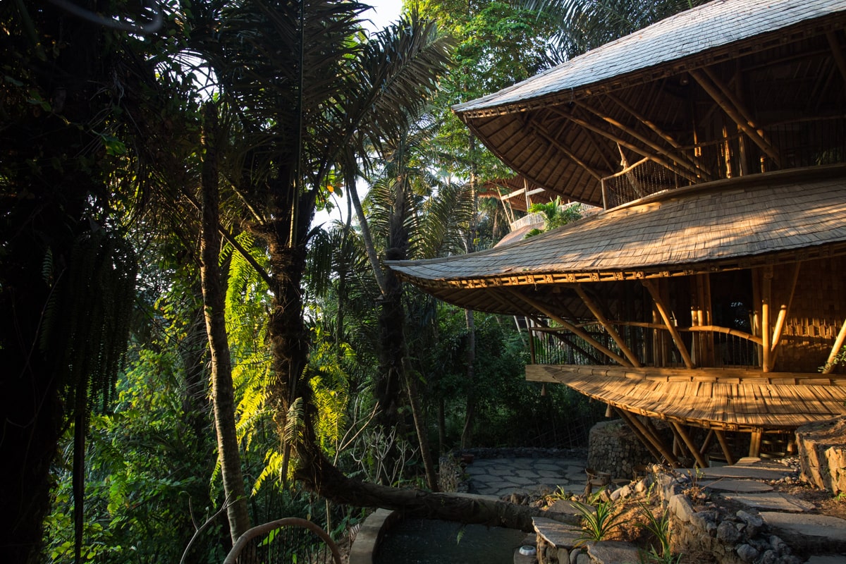 With bamboo, we have gone far beyond the age-old traditional techniques and created a myriad of new construction systems and stylistic directions. An extraordinary resource we have in Bali is that the craftspeople have a familiarity and facility with bamboo because this material has been widely utilised while also dramatically underappreciated across Asia for millennia. Until reliable natural treatment methods became known in the 90s, Bamboo was vulnerable to insect attack and couldn’t be counted on for long-lasting structures. Our legacy at IBUKU is built on Linda Garland’s work with bamboo treatment in Bali, which continues with her son Arief Rabik’s Environmental Bamboo Foundation and Bamboo Villages Initiative, centred on women and agroforestry across the archipelago.