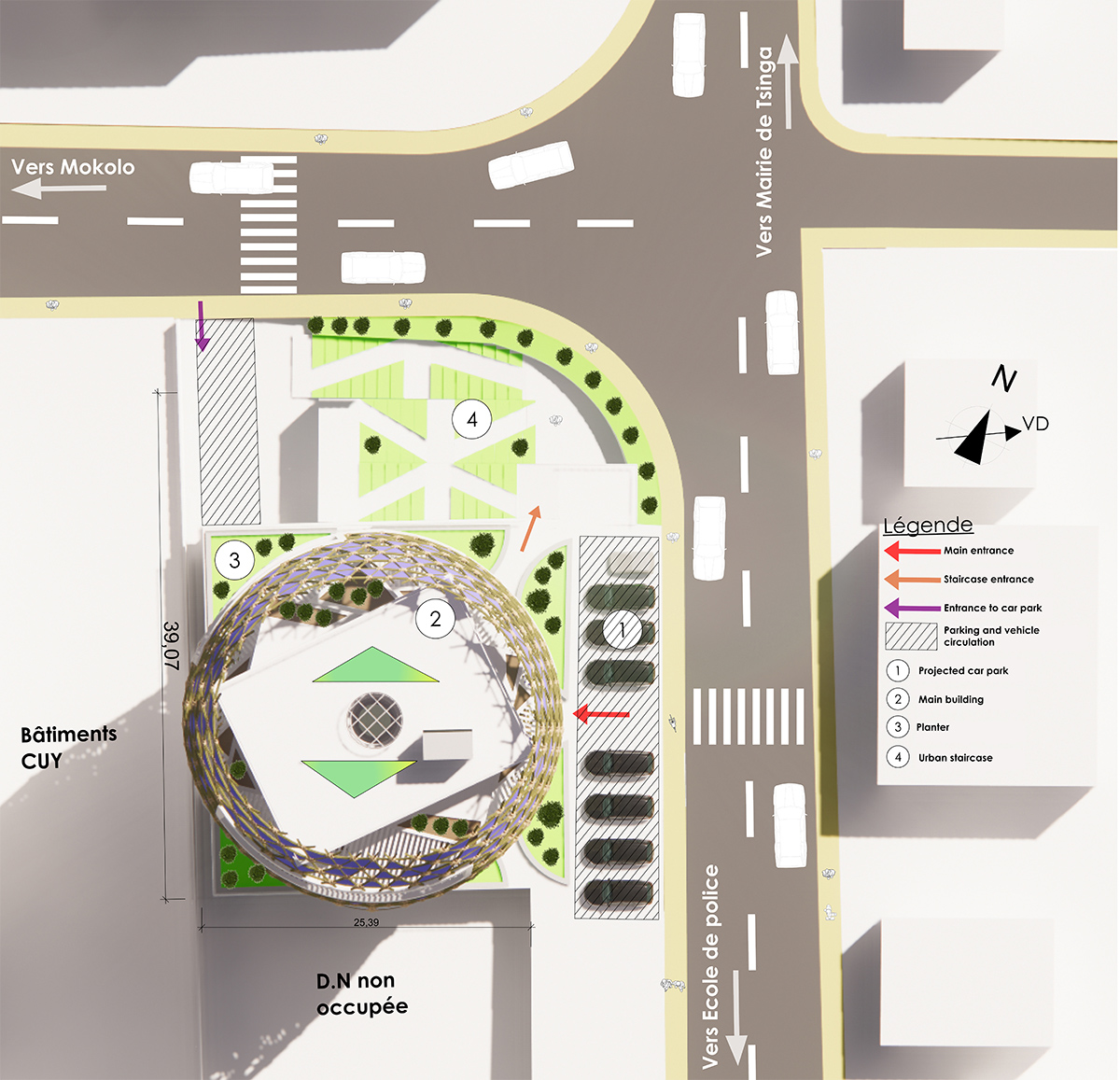 The site (1000 m2) is located in the Tsinga district, adjoining the back of a SIC (Société Immobilière du Cameroun) camp, and facing the current headquarters of the Cameroonian Football Federation, at the end of a wasteland that is recessed in relation to the planned car park in front and is served by two roads.