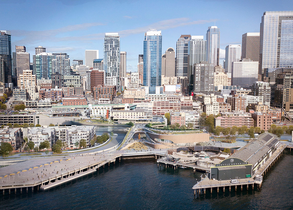 Designed by LMN Architects, a Seattle-based firm; the Pavilion connects the existing Aquarium facilities that populate Piers 59 and 60 to transition into an engaging human environment linking the city, waterfront, and ocean. A sequence of public pathways provides vertical connections between several levels within the public plazas, stitched comprehensively by interpretive NW native gardens and community spaces. These plazas will join the network of other open spaces along the waterfront and shall be adjacent to the new Overlook Walk designed by the City of Seattle Office of the Waterfront, James Corner Field Operations, Miller Hull, and Jacobs.
