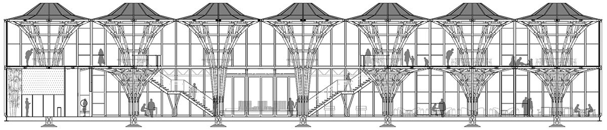 "As for vertical units design, we applied the shape of trees. The clustered column was divided into five segments, each with the length of about 2m. These segments extend outward and upward to the ceiling, forming a cubic edge space with a height of 4.5m and a side length of 8m. With such clustered columns, we not only maximized the lower space but also the structural strength," the firm added.