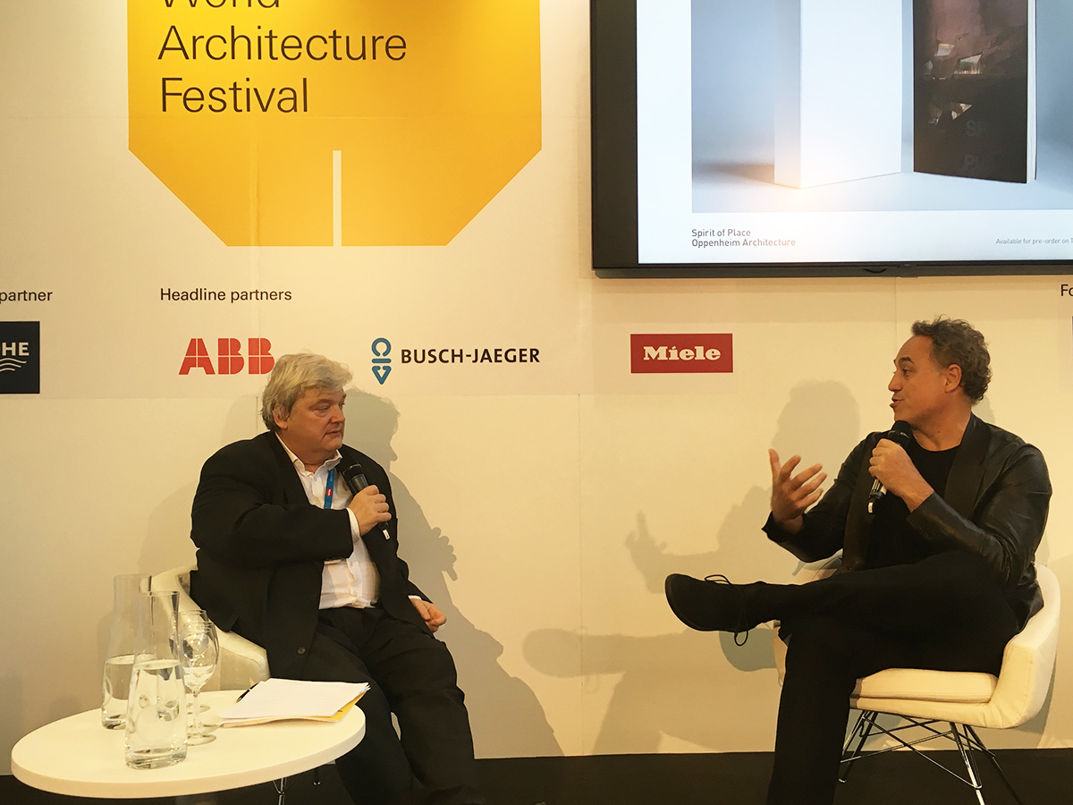Chad Oppenheim in conversation with Chair Jeremy Melvin, Curator, World Architecture Festival. Image © WAC