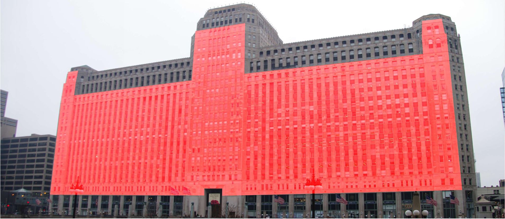 Partaking a 30-year agreement with the City of Chicago for Art on theMart, the project is funded by the building’s owner, Vornado Reality Trust. The Merchandise Mart is 25 stories tall, 4.2 million sq. ft. structure that stretches across two blocks. It is the home to wholesale decorating showrooms, art galleries, and flourishing technology incubators. At the time of its opening, 9 decades ago, it held the title of the world’s largest building. It is still the largest privately held commercial building in the United States.