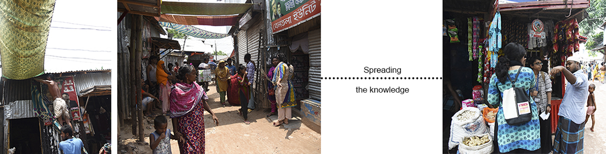 We created a semi-permeable road while keeping it smooth and mud-free. To the adjacent built forms they added second roofs to reduce indoor temperature. Furthermore, with donated bed cover and saree, long piece of fabric Bangladeshi women, wrap around them as a clothing, we created canopies shading the streets near tea-stalls where people socialize.