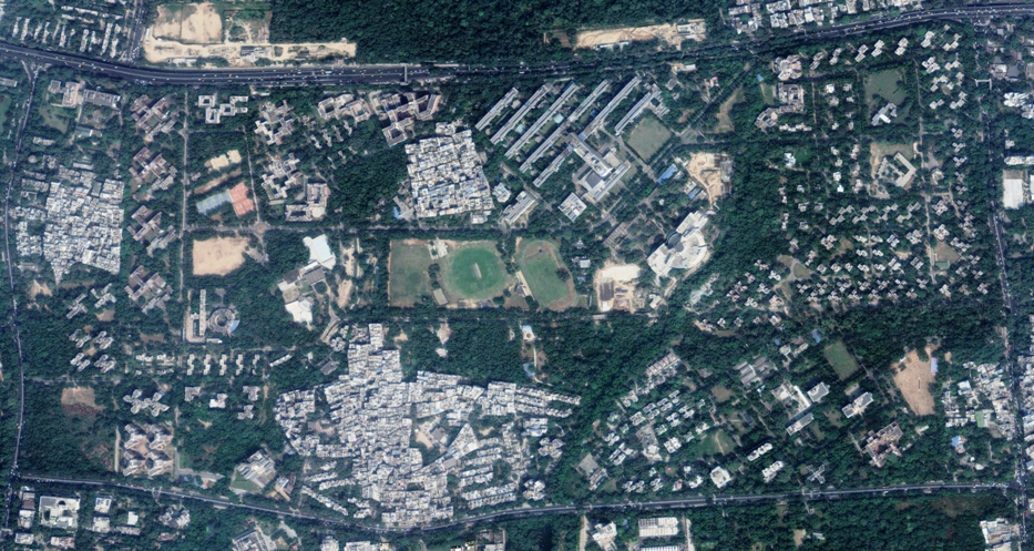 The academic complex is planned in the middle of the linear site between two natural stormwater channels. Sports and recreational area is also located in the centre, adjacent to the academic complex. Faculty and staff housing are placed on the south-east side and students' hostels on the north-west side. The juxtaposition of all these zones ensured easy accessibility of academic zone and recreational zones from all residential areas.