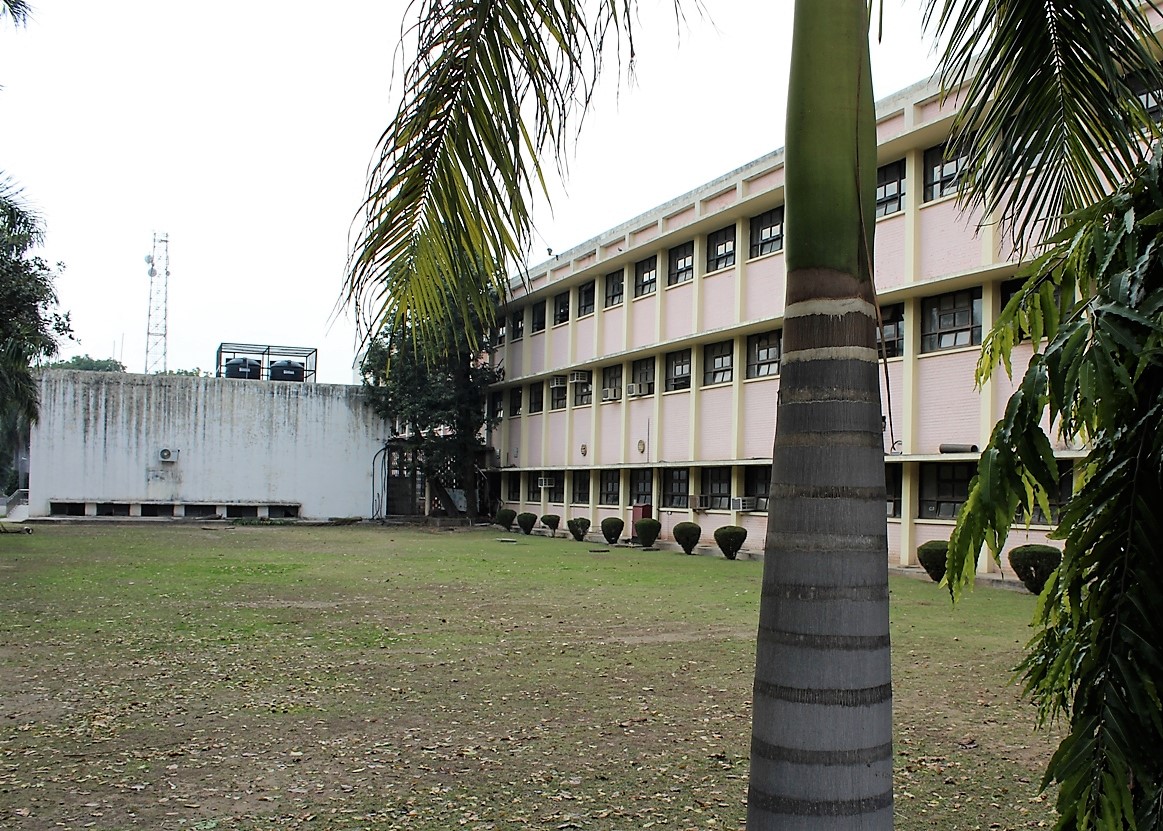 The main entrance to the institute is defined by a low-height collonaded verandah which leads to a spacious foyer having an auditorium for 350 persons on one side and a single storied administrative block on the other. The slanting roof profile of the auditorium together with collonaded verandah lend the institute an iconic image which is imprinted in the minds of thousands of alumni of PEC.