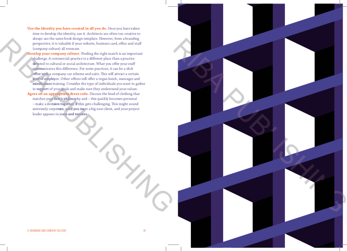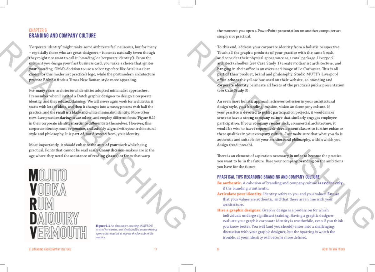 Each chapter is expounded by several sub-titles starting from branding and company culture, how to write a marketing strategy, lectures, awards, how to write a project text and press release to business development tips on the direct way to win new work and client relationships.