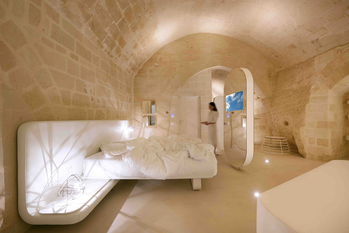 Excavated surfaces with white and fluid walls, without edges, float on the floors and create a cavernous structure for its visitors in this hotel and space complex in Matera, Italy.