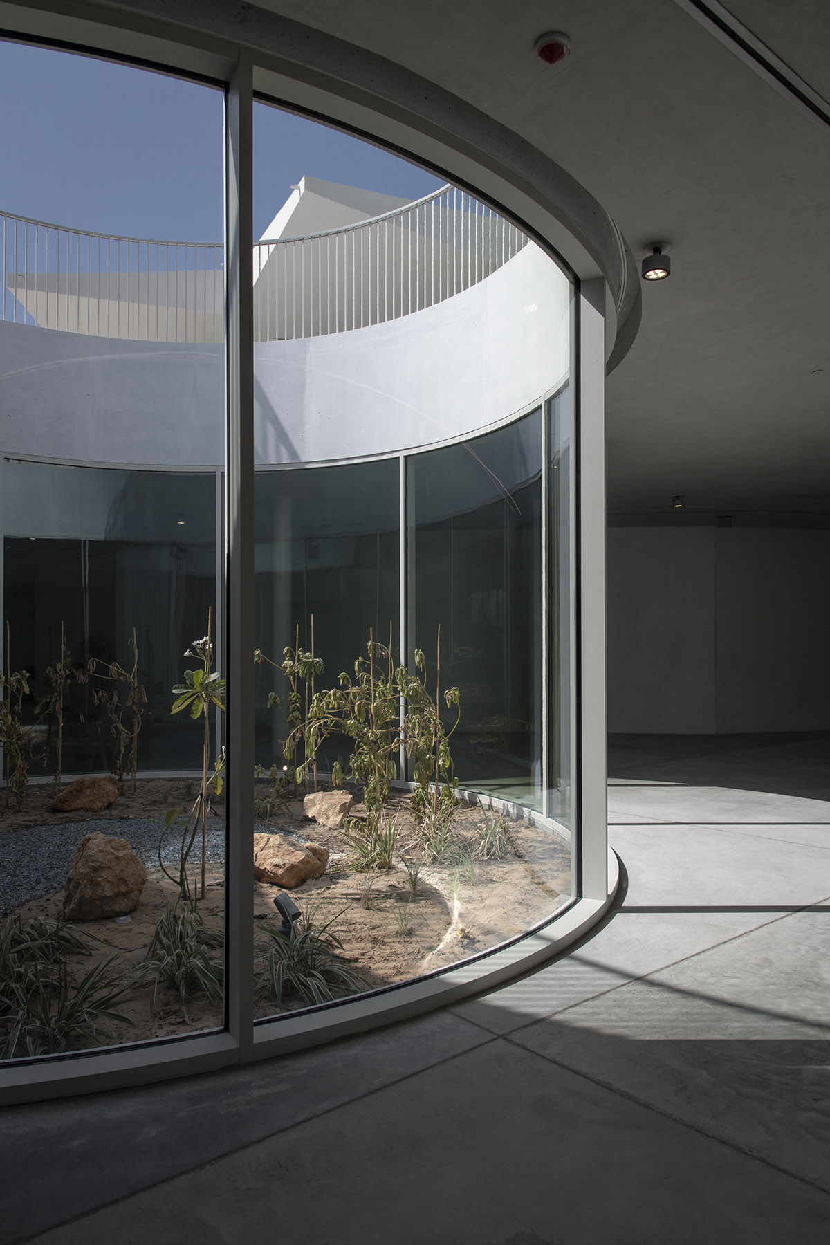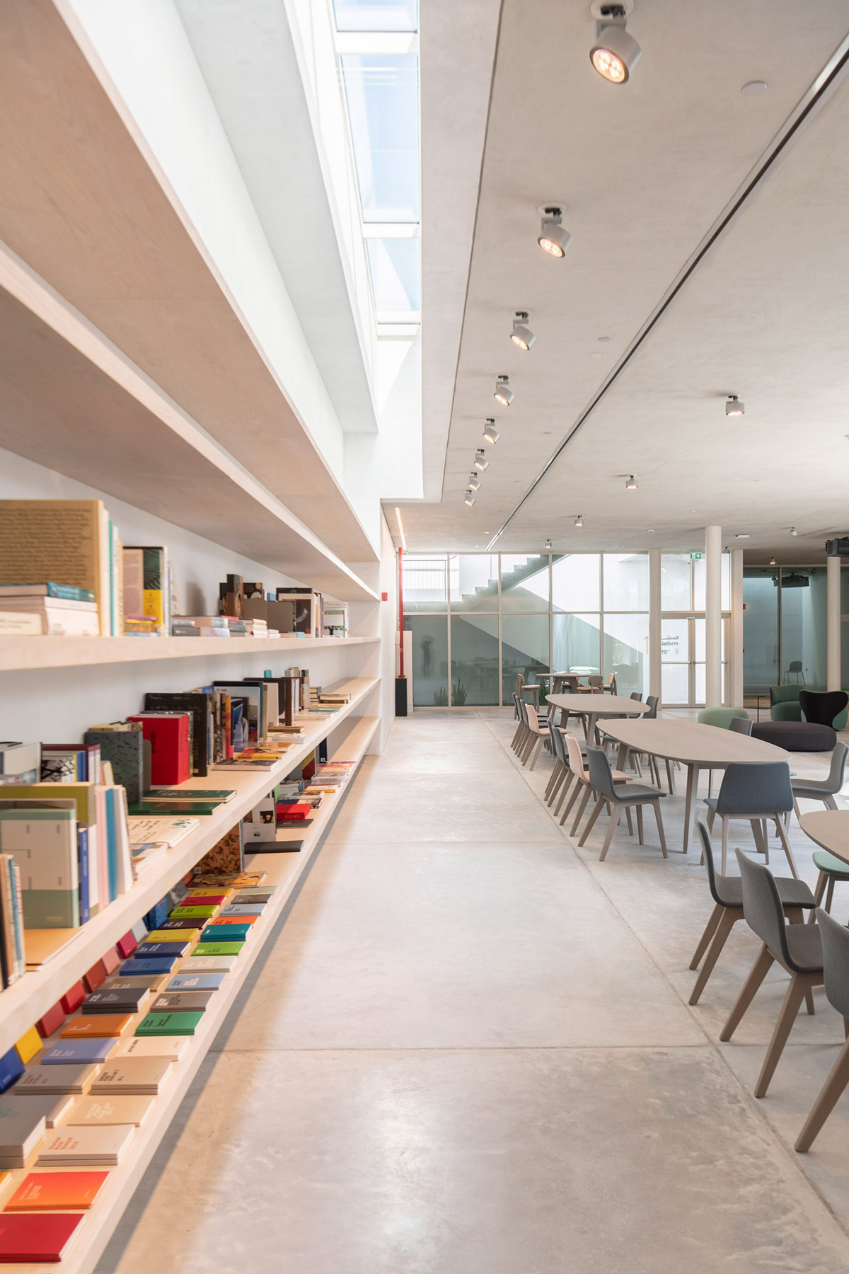 This multi-activity space includes a café overlooking the Green Crater, a curated library of publications by the Foundation and other regional institutions, enclosed Pods for meetings and workshops, as well as table stations and seating areas for workshops and socializing. The color palette of the furniture counterpoints the neutral palette of the floors, ceiling and walls. This venue houses the majority of the functions such as film screenings, workshops, performances, poetry nights, and readings; all while keeping the space under the dome clear for large installations and exhibitions.