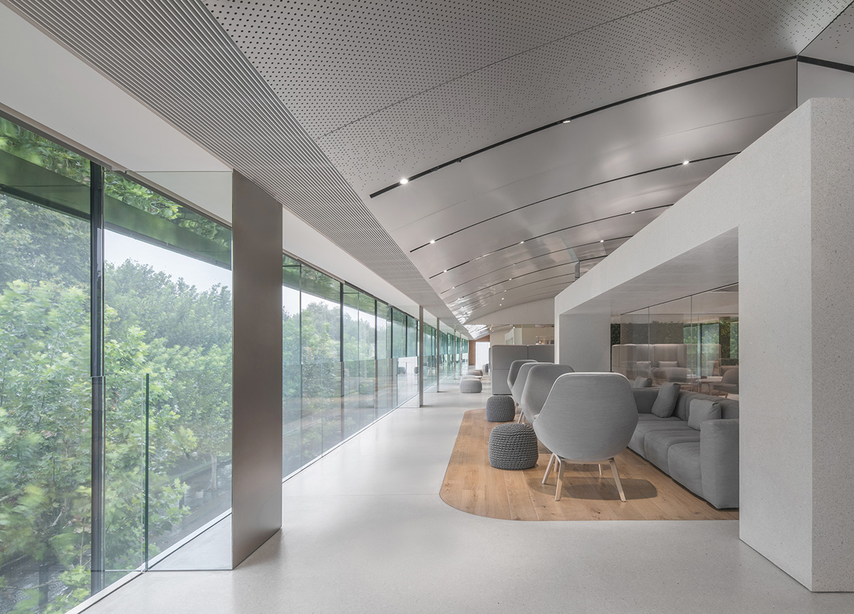 Through the utilisation of large glass panels, the facade reflects the ever-changing scenery of the West lake throughout the day. In the day, the floor to ceiling glazing allows generous amounts of natural light to flood in and provides a direct view out onto the lake, accompanied by shadows of tree branches swaying in the wind animating the internal space. When the sun sets, the roles reverse as the interior lights reveal the activities going on inside the NIO house, giving passerbys a lively show as they leisurely stroll along the lake at night.