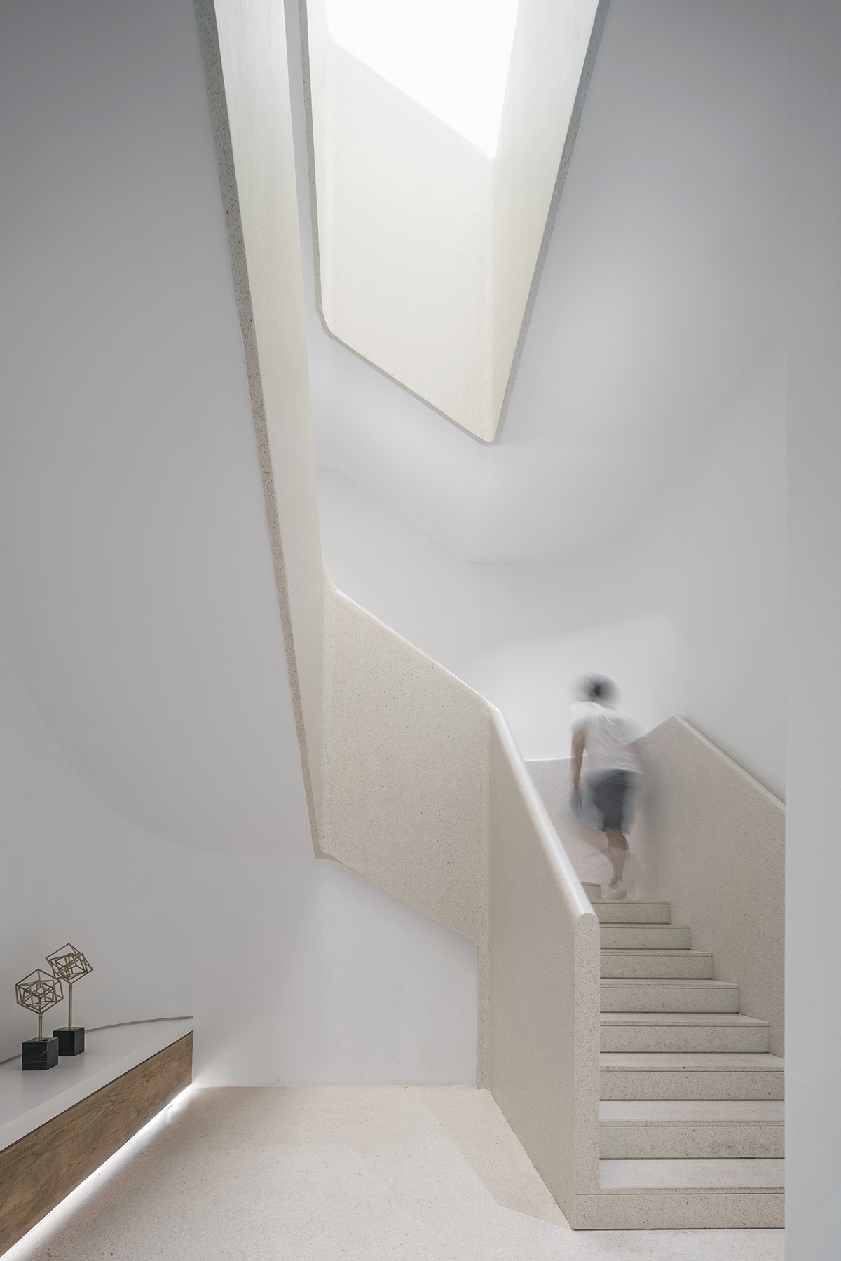 Located above the public ground level are spaces reserved for NIO members, accessible via a minimalistic white staircase.