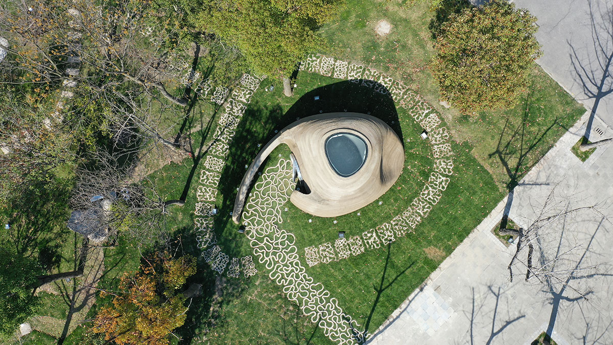 The design of the Book Cabin started from the concept sketch, then used MAYA software according to the needs of entity modeling, and carried out the space shape and structure rationality to determine the implementation model. Then through the printing path planning and printing coding to complete the digital file, and then the digital files drive the robot 3D printing equipment to concrete the materials layer by layer stack printing, thus building the curved shape of the Book Cabin. The Book Lodge has a total area of about 30 square meters and can accommodate 15 people for various activities.