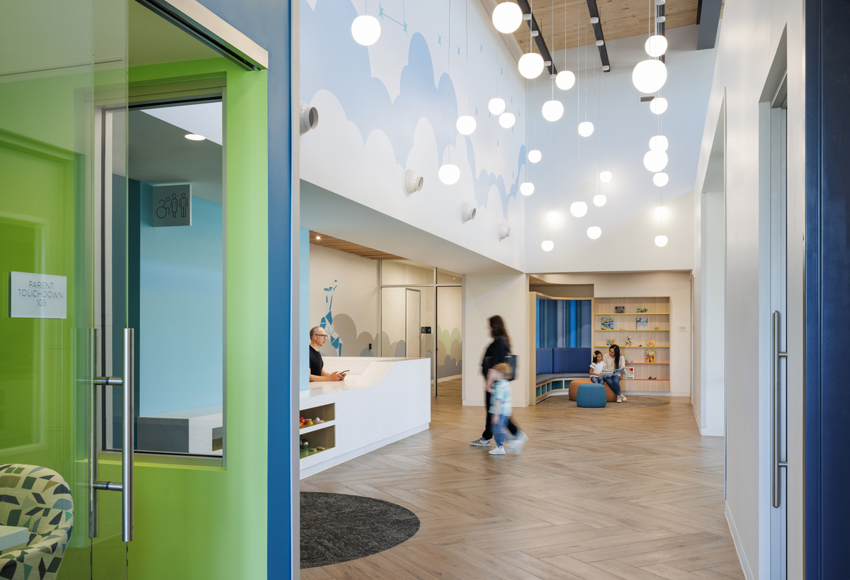 The Little Squiggles Children’s Enrichment Center at Walmart’s headquarters spans 73,000 sq ft (6,780 sq mt) across two buildings, accommodating up to 516 children, from infants to pre-kindergarteners. One standout feature is the “Parent Plaza," designed for parents to engage with their children during the workday, supporting work-life balance and family connectivity.